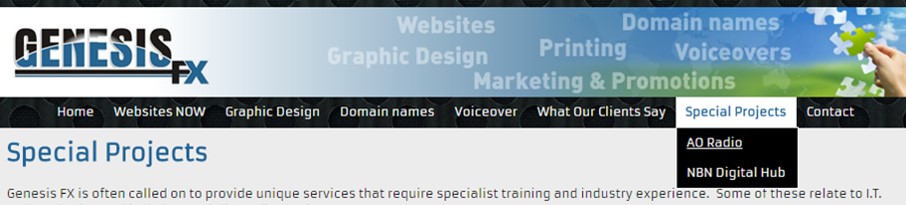 Our websites allow for multiple menu levels. This means you can easily break down your pages into parent pages and two levels of sub-pages (these form part of a drop-down menu). In the example below the top level menu is Special Projects, under that heading are two sub pages – AO Radio and NBN Digital Hub.